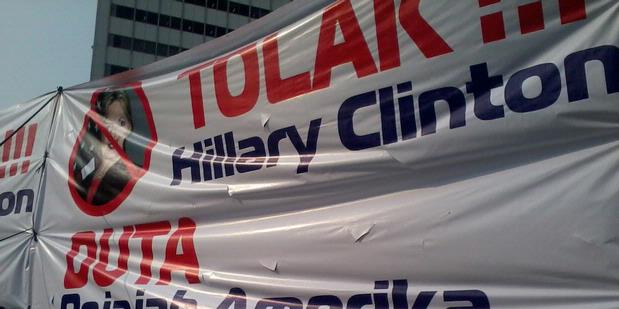 (4/9/2012) sore. Spanduk dengan foto Menteri Luar Negeri Amerika